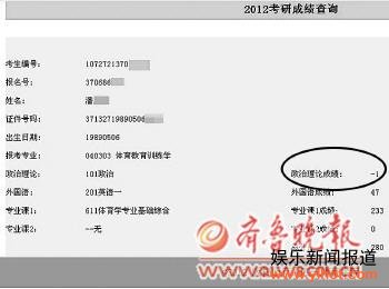 小潘是山东省鲁东大学大四学生,报考了西安体育学院体育教育训练学的研究生。2月28日下午成绩公布,小潘上网查询。但结果让他猝不及防:外国语成绩47分,专业课成绩是233分,而政治理论成绩一栏居然显示的是-1分。